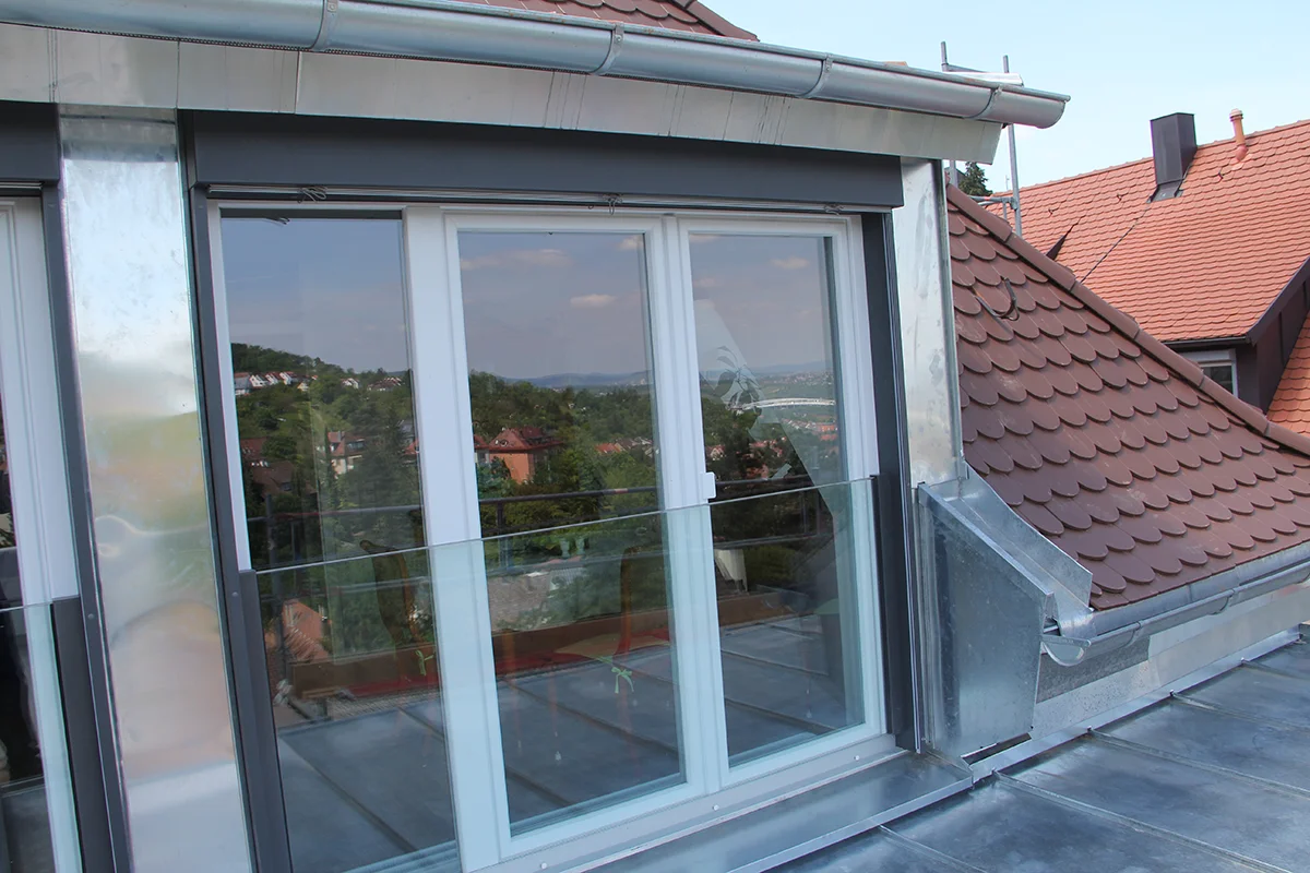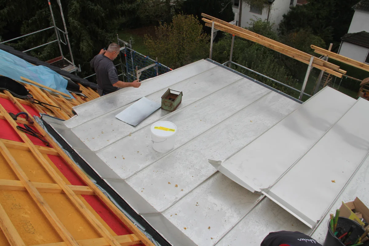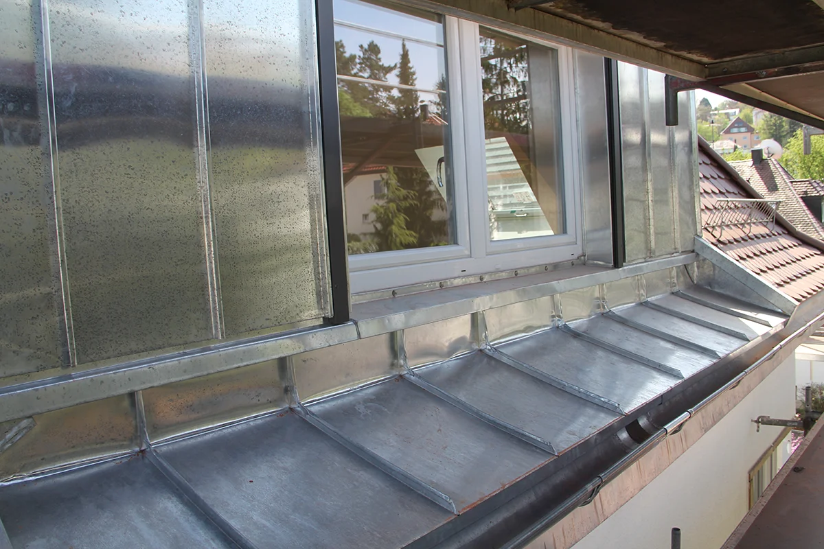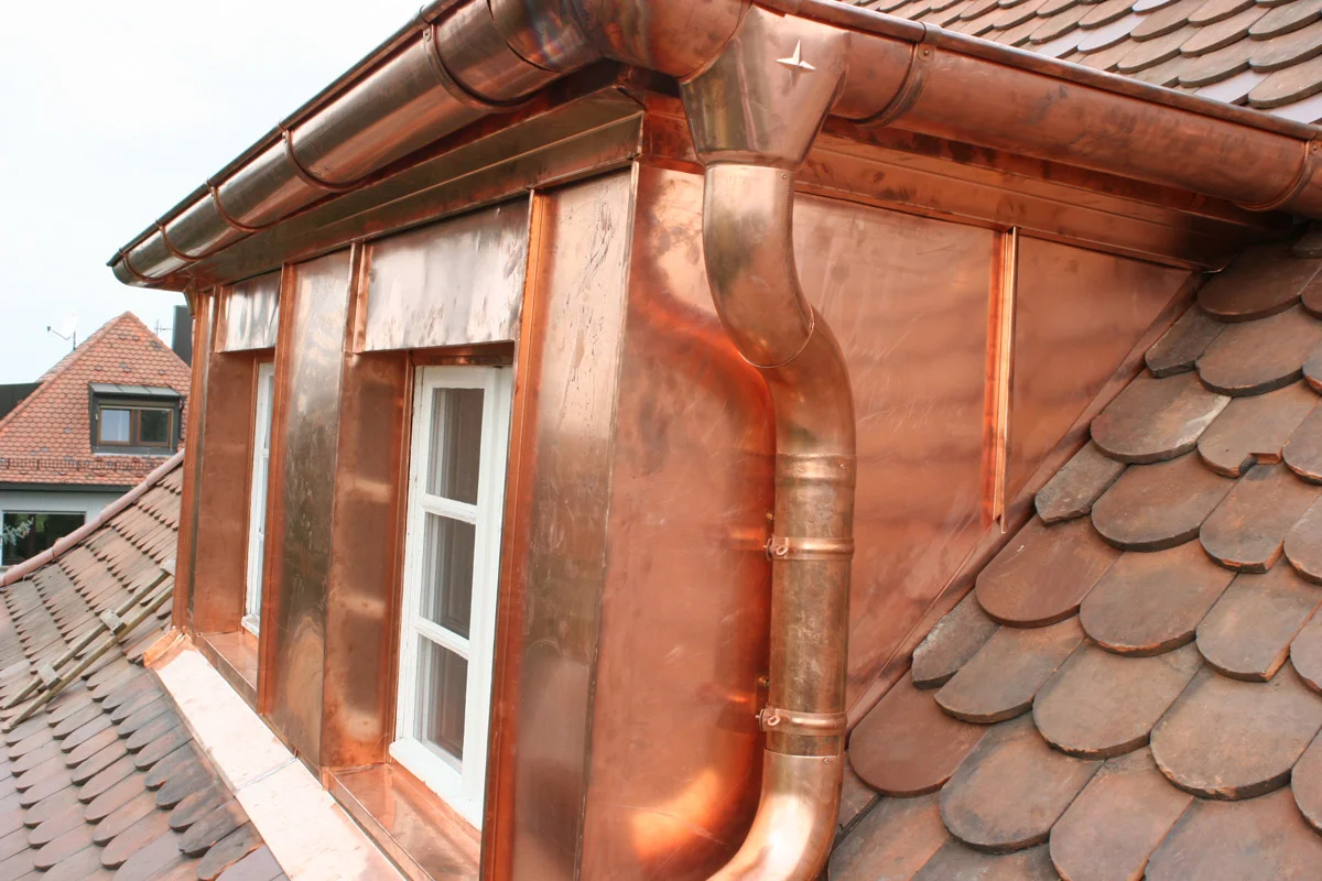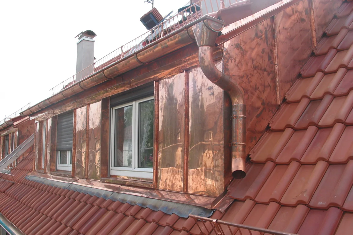 Metallarbeiten an Dach und Fassade: Dachrinnen/Fallrohre, Stehfalzdächer, Anschlüsse an Kamin/Gauben, Attika-Verkleidungen, Fassadenbekleidungen und Sonderbleche.
